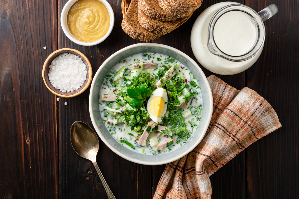 Все, что нужно для вкусной прохладной окрошки – сварить картошку и яйца, а затем быстро покрошить все ингредиенты. Многие любят окрошку на кефире, который можно разбавить водой или сывороткой, если суп получается слишком густым. Подойдет и простокваша. Наших соотечественников в других странах, где нет кваса, это очень выручает. Но даже если кваса предостаточно, попробуйте вариант с кефиром – у такой окрошечки особенный вкус.