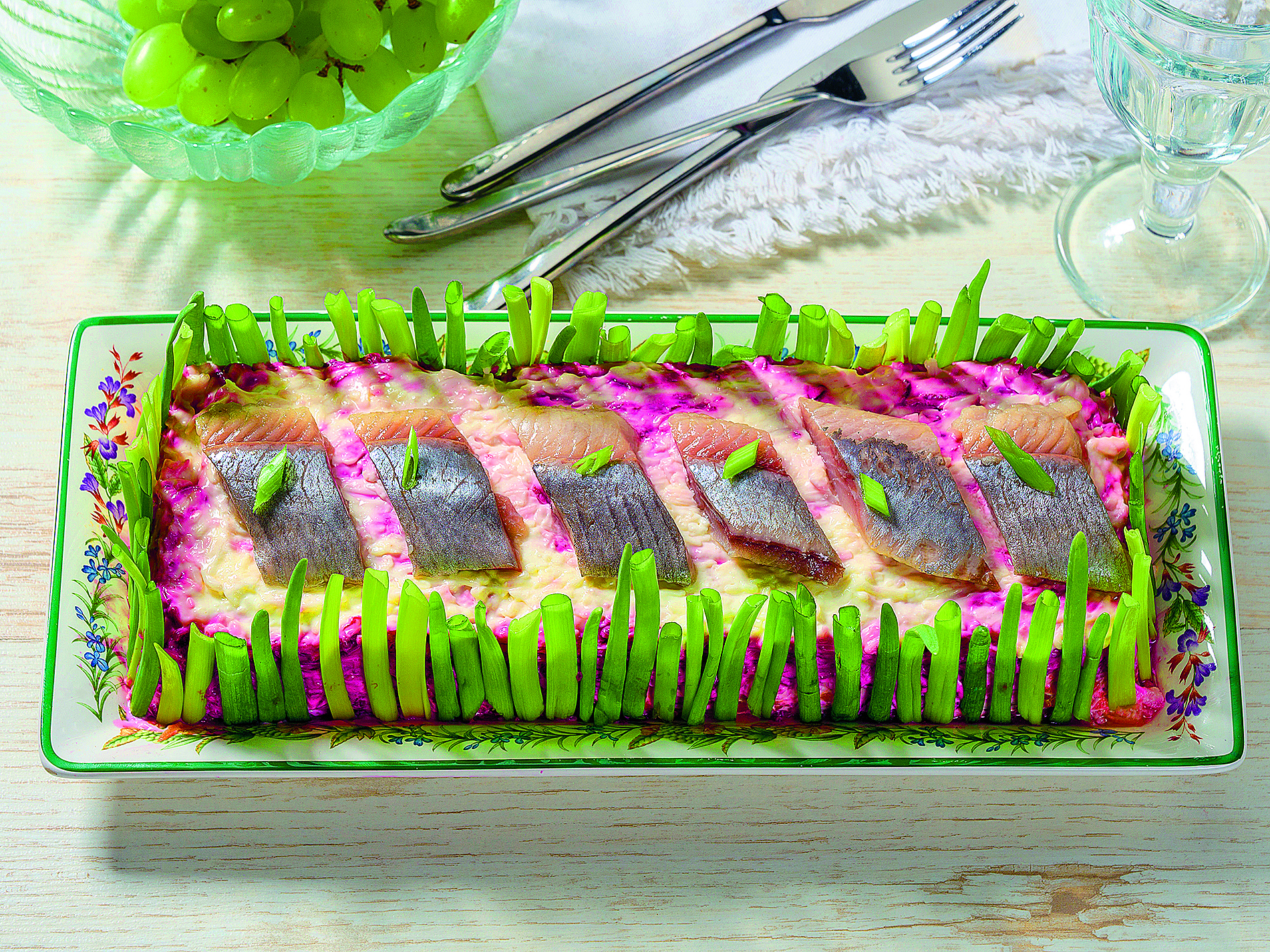 Перед подачей выкладываем поверх «шубы» оставшуюся селедку. Зеленый лук нарезаем наискосок и прикладываем в виде щеточки с боков салата.