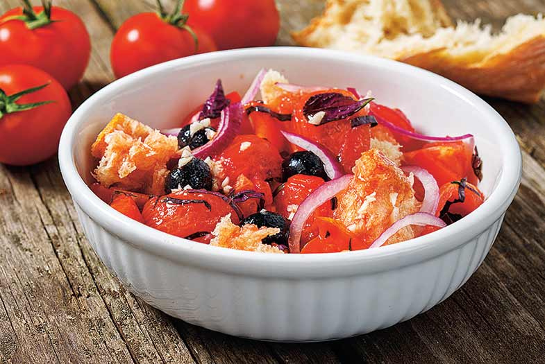 Помидоры и запеченные под грилем перцы очищаем от кожицы и семян, мякоть нарезаем. Семена и внутреннюю мякоть помидоров перетираем через сито. Получившийся сок смешиваем с уксусом, солью, перцем, маслом, полукольцами лука и рубленым чесноком. Через 10 минут перемешиваем все ингредиенты салата с заправкой, добавив маслины, листики базилика и кусочки хлеба.